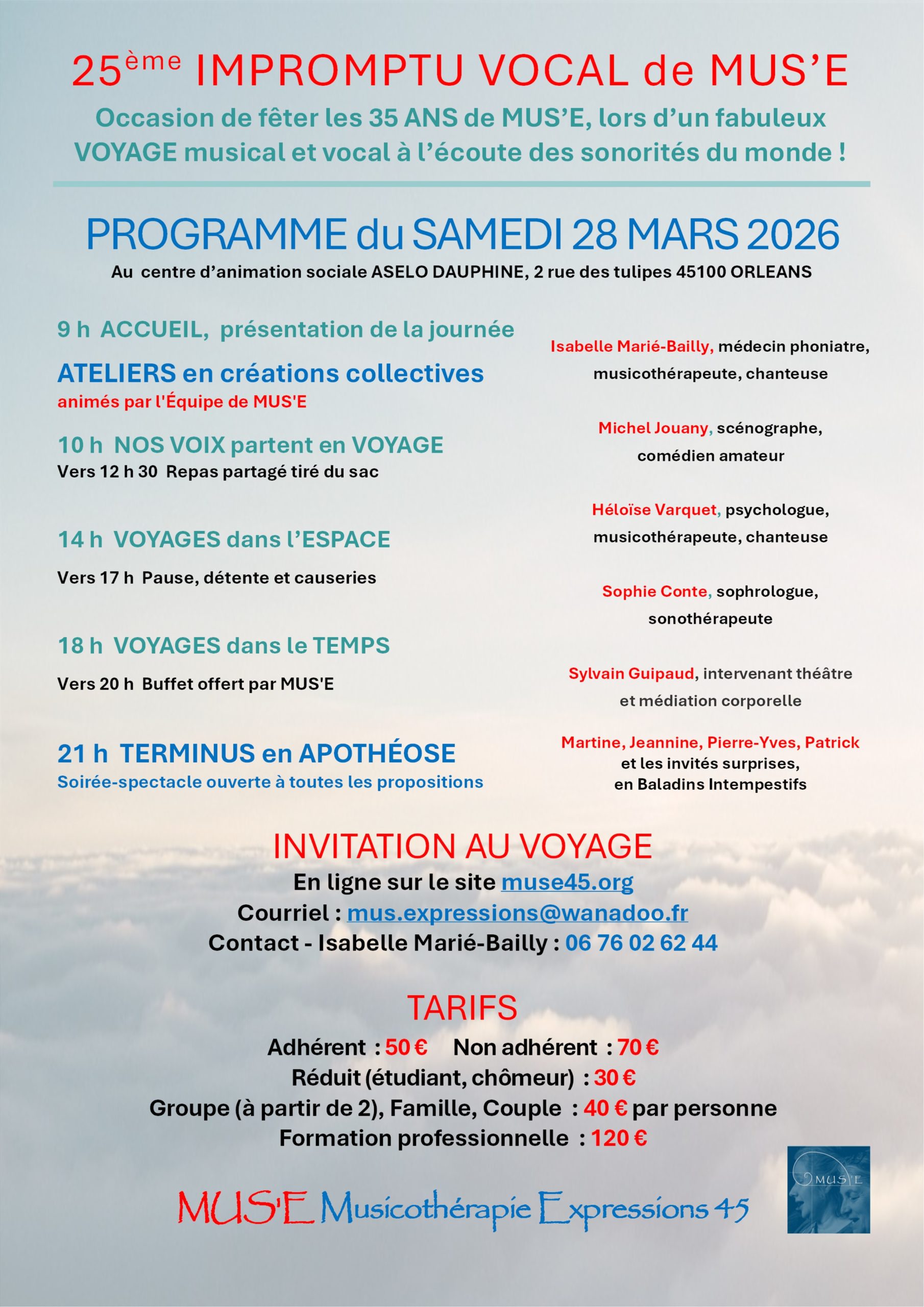 Occasion de fêter les 35 ans de MUS’E en compagnie des MUS’O’Philes et PhiloMuses, anciens intervenants ou stagiaires de MUS’E, musiciens, musicothérapeutes, orthophonistes, « baladins intempestifs » pour un fabuleux voyage musical et vocal, à l’écoute des sonorités du monde !