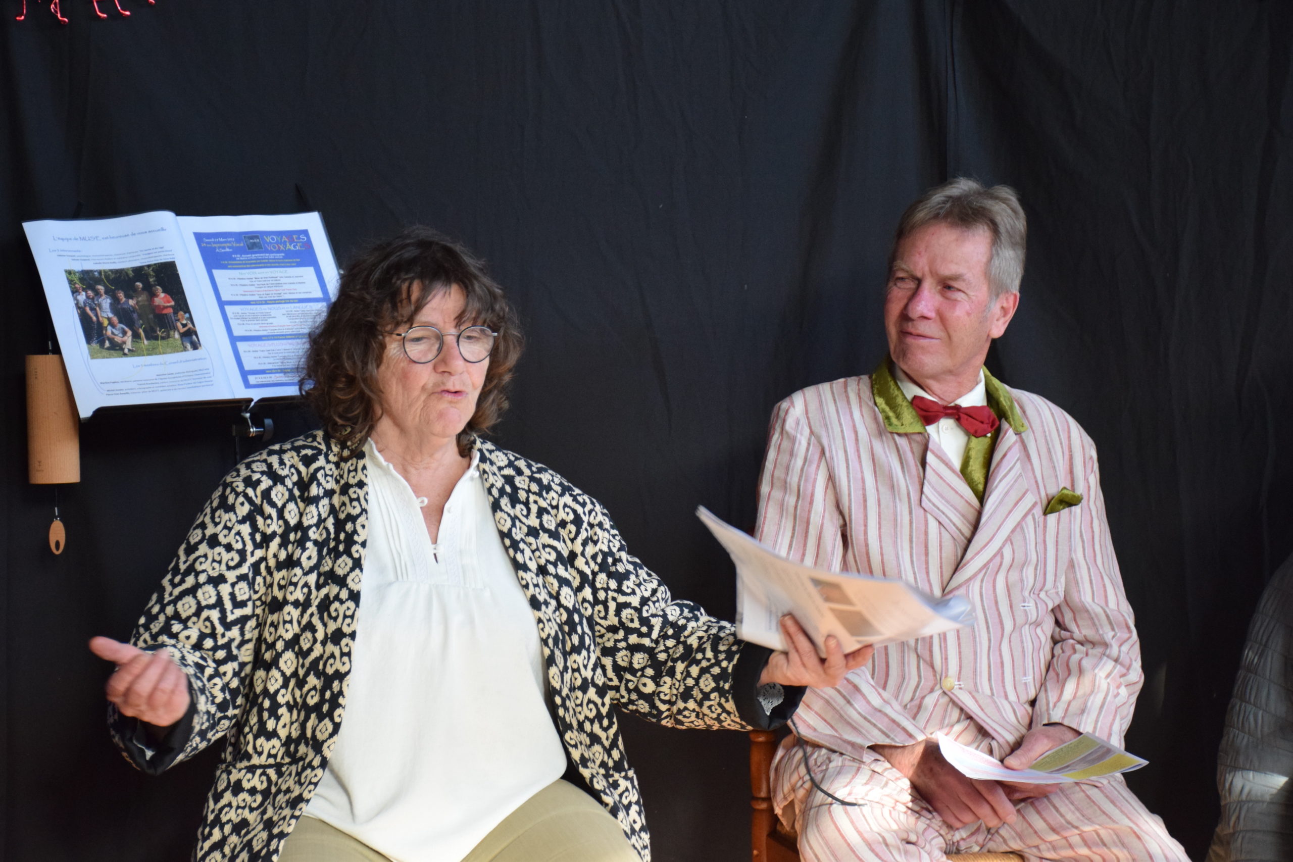 - Marie-Noëlle Vigneron, enseignante à la retraite, actrice, nouvelliste aphasique diplômée à Couleurs de Voix en mars 2021 et Voyage-voix’age-mars-2025 qui vous accueillera sous son parasol pour recueillir vos carnets de voyage et en faire une restitution à l’APOTHEOSE.